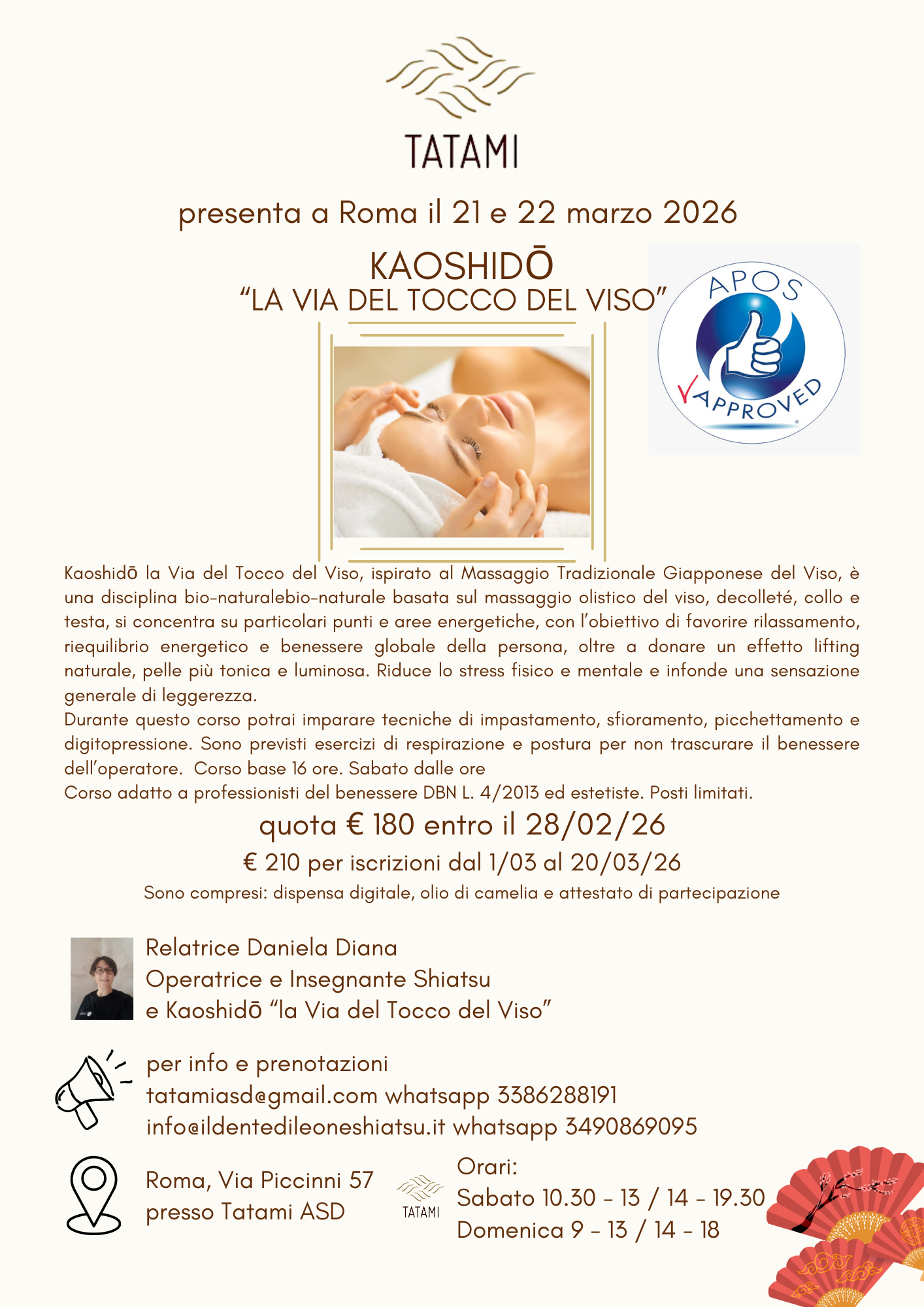Tecniche tipiche del massaggio antico giapponese, digitopressione, panoramica su meridiani energetici e muscoli facciali. Il corso base è di 16 ore e verrà rilasciato un attestato di partecipazione; è rivolto a operatori e operatrici del settore del benessere, DBN L. 4/2013 ed estetiste o a persone che vogliono avvicinarsi al mondo delle discipline bionaturali.